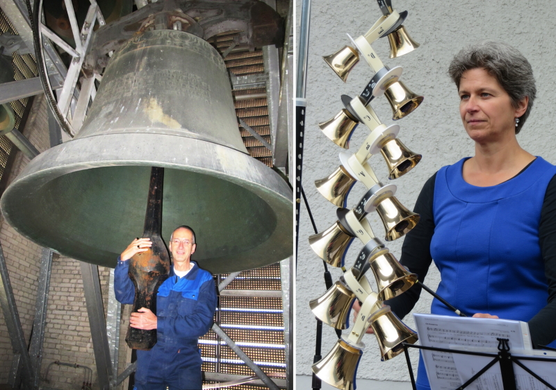 Les extrêmes se touchent! Leichte kleine Handbells am "Glockenbaum" (Belltree) gegen die größte Glocke der reformierten Stadtkirche Solothurn mit 5 Tonnen Gewicht! Die Kugel des Klöppels ist größer als der Kopf des Spielers, der sein ganzes Gewicht einsetzen musste, um nur schon den Klöppel bewegen zu können.