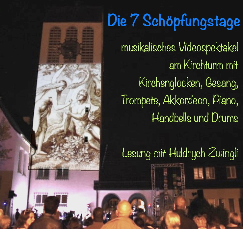 Eine Supershow mit Turmglocken, Sängerin, Band und Videoprojektion zu den 7 Schöpfungstagen am 100-Jahr Jubiläum der ev.ref. Kirchgemeinde Reiden (LU, Schweiz) am 8. September 2018. Der Videoclip unten zeigt die Nummer mit Conquest of Paradise (Amateurvideo aus dem Publikum). Eric Nünlist von GoldenBells stand im Turm an den präparierten Glocken, Sylvia Stampfli mit einem Belltree vor dem Publikum. Weitere Mitwirkende waren Regula Zimmerli Gesang, Yvonne Glur Akkordeon, Seniorenmusik Reiden, Nic Russi Videokunst und Regie.